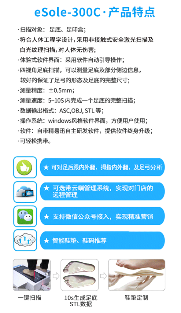 足底扫描仪在3D打印鞋垫的应用中,可以帮助商家以及厂家更加精确地获取用户的足部数据,从而生产和设计出更符合个人需求的鞋垫。